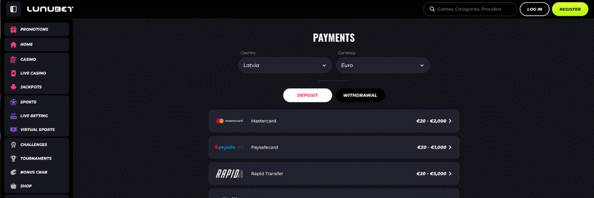 LunuBet kazino piedāvā vairākas maksājumu metodes. Pieejamas gan tradicionālās banku kartes, gan populāri e-maki , kā arī daudzas kriptovalūtas. Minimālais depozīts un arī minimālā izmaksa ir 20 EUR, bet maksimāli katrai transakcijai var pārskaitīt līdz 2000 – 5000 EUR. Visa ieskaitītā nauda tiek pievienota kontam momentāni, savukārt naudas izmaksas ātrums ir atkarīgs no izvēlētās metodes.