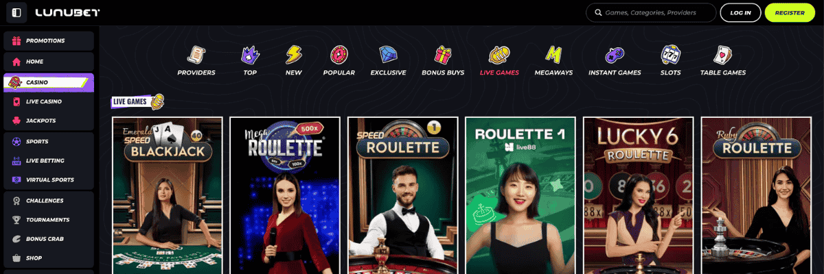 LunuBet kazino spēles katalogs ir iespaidīgi plašs. Tajā ir gan video spēļu automāti, gan galda spēles, gan tiešraides dīleru istabas. Piedāvājuma centrā ir pazīstami piegādātāji – Pragmatic Play ar populārām “hit” spēlēm, ELA Games ar oriģinālām tēmām un funkcijām, kā arī Evolution live galdos ar ruleti, blekdžeku un šovu tipa spēlēm.