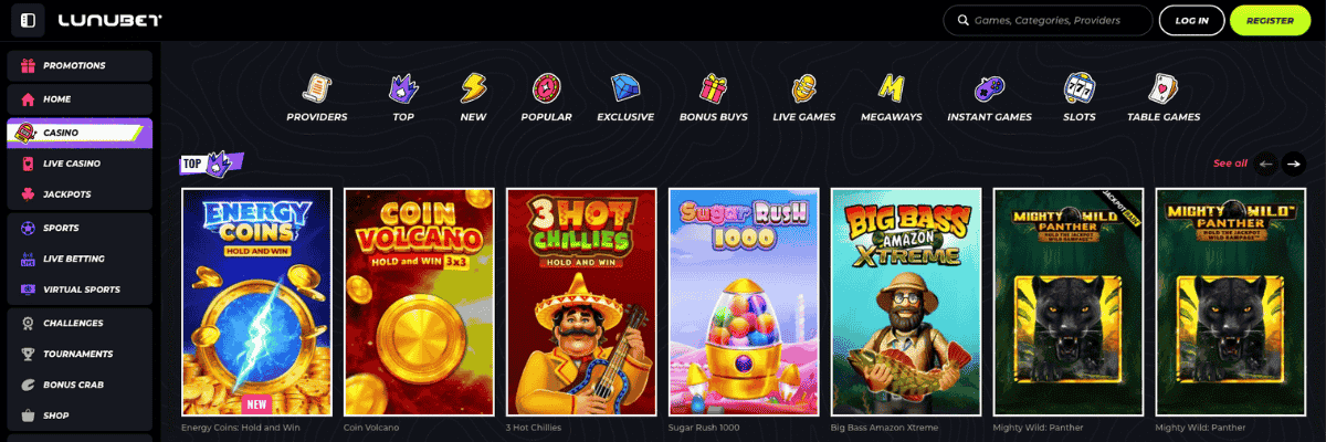 LunuBet tiešsaistes kazino spelētāji visbiežāk atgriežas pie trim studijām: Pragmatic Play (Gates of Olympus, Sweet Bonanza), Play’n GO (Book of Dead, Rise of Olympus) un Evolution “live” sadaļā (Lightning Roulette, Crazy Time). Šie nosaukumi sedz gan spēļu automātu klasiku, gan šovu tipa spēles. Pārējos piegādātājus meklē “Providers” lapā. Tas lietotājam sniedz izvēli no parastākajiem azartspēļu automātiem līdz tiešsaistes šoviem.