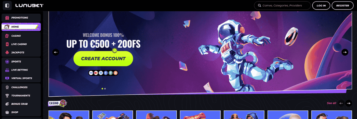 LunuBet ir ārzemju kazino un sporta likmju vietne, kas 2023.–2025. gadā strauji paplašinājusi spēļu klāstu un bonusu piedāvājumu. Šis kazino izceļas ar tūkstošiem automātu, plašu “live” sadaļu un sporta likmes vienā platformā. Navigācija ir vienkārša, mobilā versija – ērta, un izvēlnēs var pārslēgties starp vairākām valodām, lai saturu uztvertu arī spēlētāji no Latvijas.