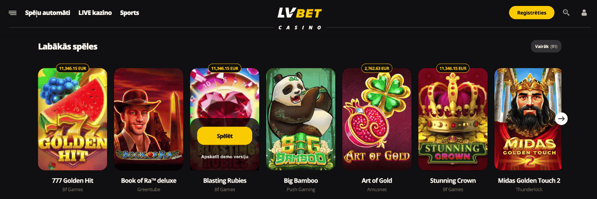 LVBet ir salīdzinoši jauns Latvijas tiešsaistes kazino, kas ieguvis vietējo IAUI licenci 2020. gadā. LVBet online kazino izceļas ar vienu no lielākajām un daudzveidīgākajām spēļu automātu kolekcijām Latvijā – no klasiskām augļu spēlēm līdz jaunākajiem video slotiem un progresīvajiem džekpotiem. Platforma apvieno kvalitatīvu kazino pieredzi ar pilnvērtīgu sporta likmju sadaļu, piedāvā ērtu mobilo spēlēšanu (t.sk. lietotni) un ātras izmaksas.