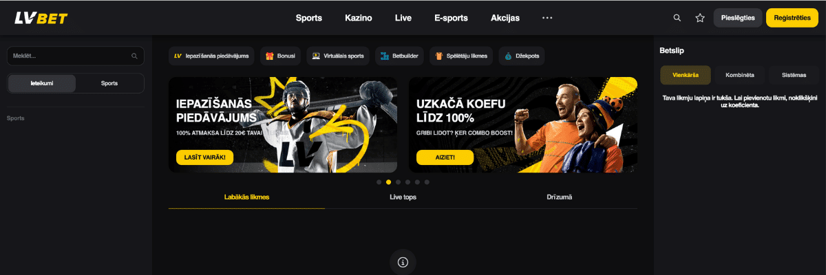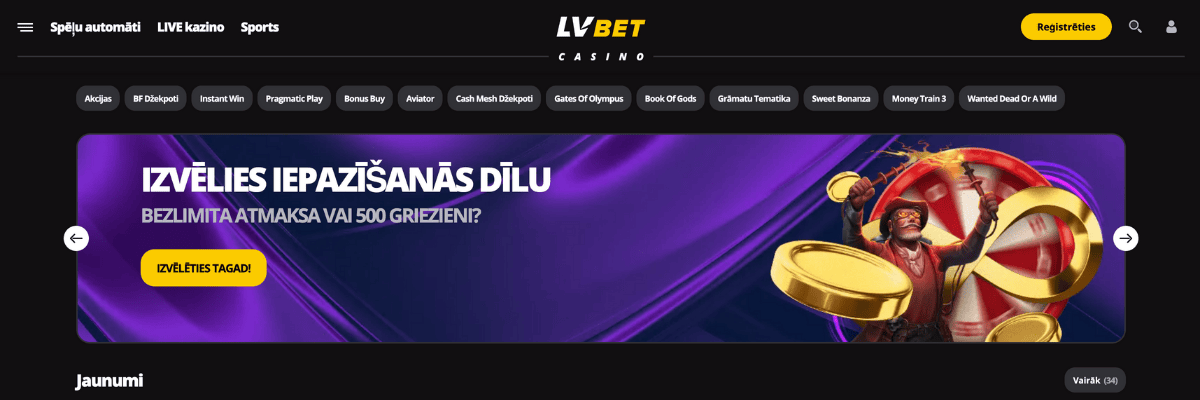 LVBet mājaslapa veidota tumšos toņos ar dzelteniem akcentiem; augšējā joslā redzamas sadaļas Kazino, Live kazino, Sports, Live likmes, Akcijas un Palīdzība. Spēles var filtrēt pēc piegādātāja un kategorijām (“Jaunas”, “TOP”, “Džekpoti”), bet meklētājs ātri atrod konkrētus nosaukumus.