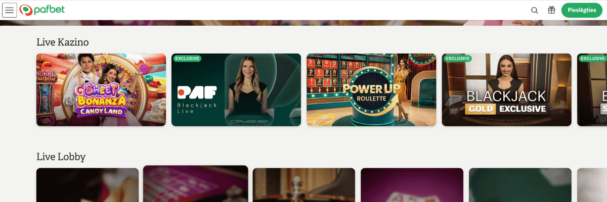 Live kazino Pafbet ir veidots pēc “kvalitāte > kvantitāte” principa: atlasīti Evolution un Pragmatic Play galdi – no klasikas līdz modernām versijām ar reizinātājiem, un viss darbojas 24/7. Vērts pieminēt arī “Exclusive” galdu klāstu, piem., Blackjack Gold Exclusive un Grand Casino Roulette, kas piešķir lobijam “premium” sajūtu.