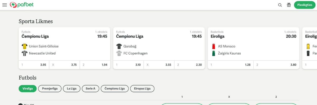 Aktīvi tiek atjaunotas likmes gan pirms notikuma, gan Live režīmā. Turklāt kupons ir pārskatāms: likmes izvēle, likmes lielums un potenciālais laimests redzami vienā skatā, arī mobilajā. Live sadaļā noder reāllaika statistika un notikumu filtrs. Salīdzinot ar konkurentiem, Pafbet retāk “pārkrauj” ar baneriem, tāpēc navigācija ir ātrāka un fokusētāka intensīvu spēļu laikā.
