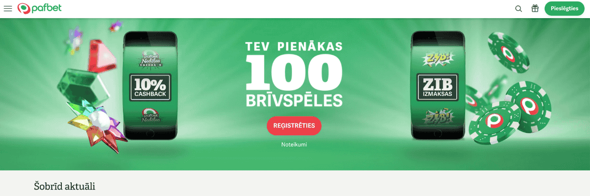 Vērtīgākā reģistrācijas akcija ir minētie 100 bezriska griezieni. Lai tos saņemtu, jauns spēlētājs veic vienu depozītu ≥20€, pēc tam Pafbet atsevišķā kārtībā aktivizē 50 griezienus Book of Ra Deluxe un 50 griezienus Green Star bez riska. Mūsu atsauksmes liecina, ka Pafbet periodiski izsludina arī tematiskas brīvspēļu kampaņas sadaļā Piedāvājumi – tās parasti piesaistītas jaunām vai īpaši izceltām spēlēm.