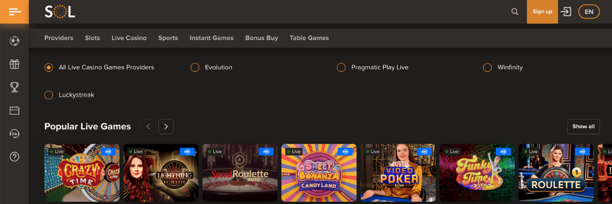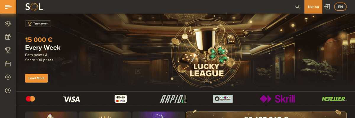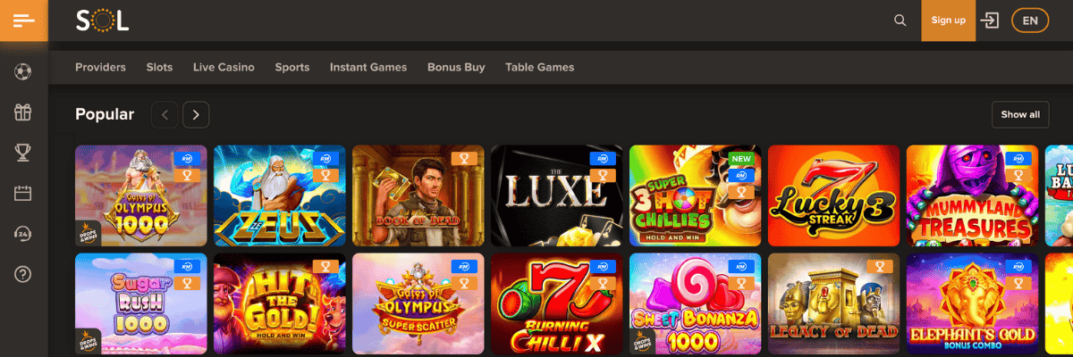 Ienākot SOL Casino mājaslapā, uzreiz iekrīt acīs tā tumšā, bet tomēr stilīga vizuālā identitāte, un tas, savā ziņā, rada profesionālu iespaidu par šo operatoru. Arī navigācija un iešana cauri lapai ir diezgan ērta un vienkārša. Galvenās mājaslapas sadaļas ir skaidri sadalītas pa kategorijām, tāpēc var ātri atrast visu kas nepieciešams – casino spēles, bonusu sadaļu, maksājumu metodes un citas sadaļas.