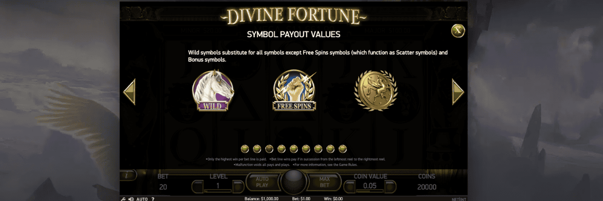 Minimālā likme Divine Fortune spēļu aparātā ir €0,20 par griezienu.
