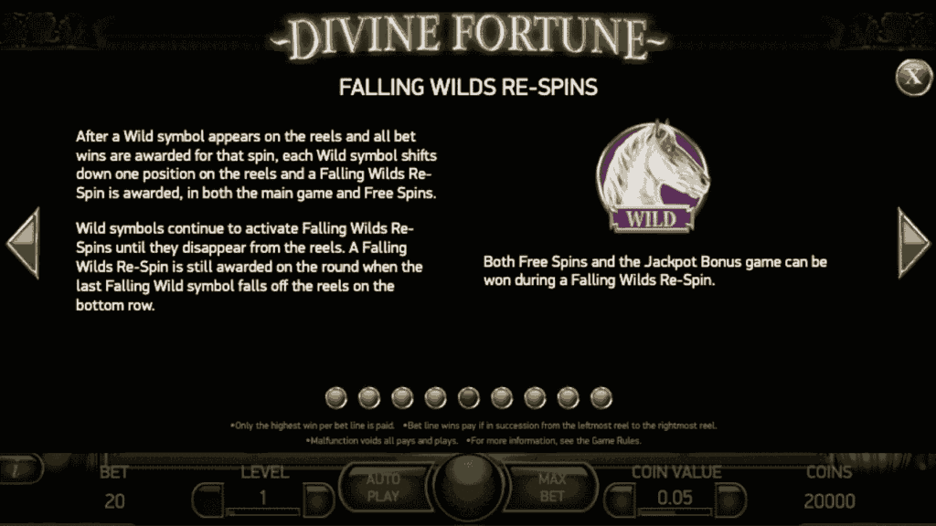 Falling Wilds Re-Spins ir viena no Divine Fortune ikoniskākajām īpašajām iespējām. Tā aktivizējas jebkurā brīdī, kad uz ruļļiem parādās Wild simbols (Pegazs). Kad Wild izkrīt, tas piešķir vienu atkārtotu griezienu (re-spin) un “krīt” par vienu pozīciju uz leju.