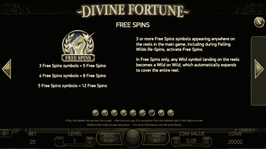 Šī bezmaksas griezienu funkcija Divine Fortune spēļu automātā sniedz iespēju griezt ruļļus bez papildu maksas un ar paaugstinātu laimestu potenciālu. Free Spins režīms tiek aktivizēts, kad vienlaikus izkrīt vismaz 3 Scatter simboli (Zeva zibens).