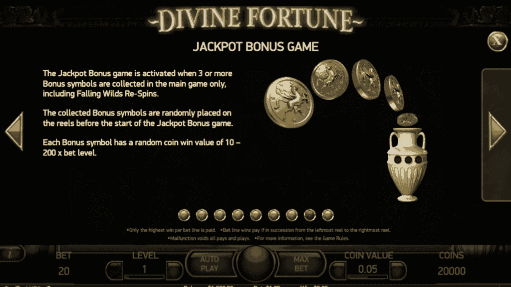 Jackpot Bonus spēle ir Divine Fortune bonusa raunds, kurā var tikt iegūti trīs dažādi džekpota bonusi – Minor, Major vai Mega. Šis raunds sākas, kad pamata spēles laikā vai Falling Wilds atkārtoto griezienu laikā uz ruļļiem sakrājas vismaz 3 zelta monētu bonusa simboli.
