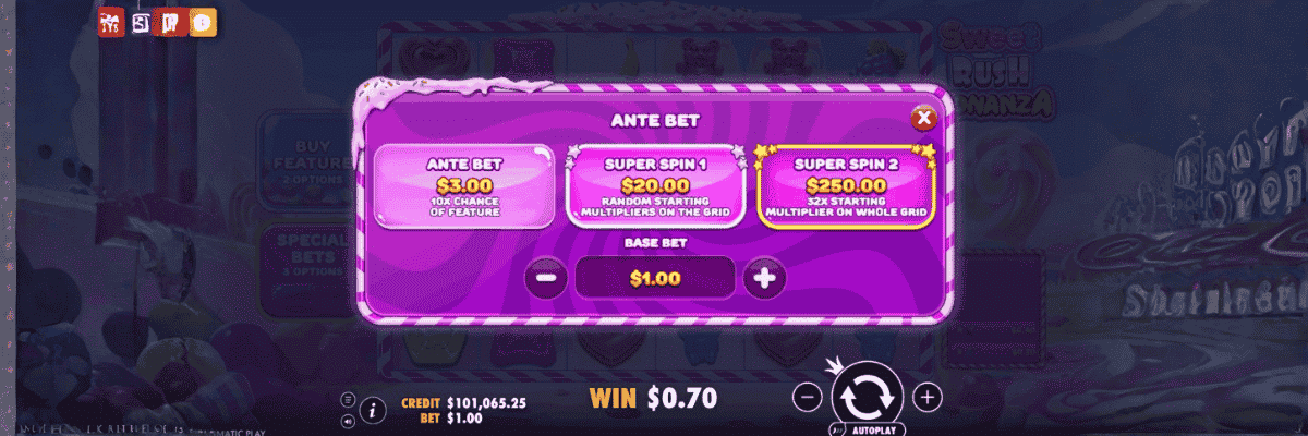 Sweet Rush Bonanza īpaši padomāts par tiem, kas vēlas palielināt savu izredžu intensitāti. Spēlē pieejamas uzreiz trīs dažādas Ante likmju opcijas: