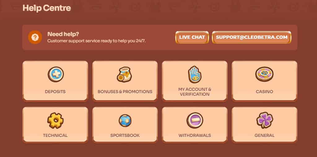 Поддержка в CleoBetra казино онлайн доступна круглосуточно и помогает в решении любых проблем, связанных с работой казино – от регистрации до вывода выигрышей. Связаться с поддержкой напрямую можно двумя способами: через онлайн-чат на сайте (ответ придет через 1–3 минуты) или по электронной почте (ответы предоставляются в течение суток, жалобы рассматриваются в течение 10 дней). А ответы на самые распространенные вопросы можно поискать в Help Centre в футере сайта.
