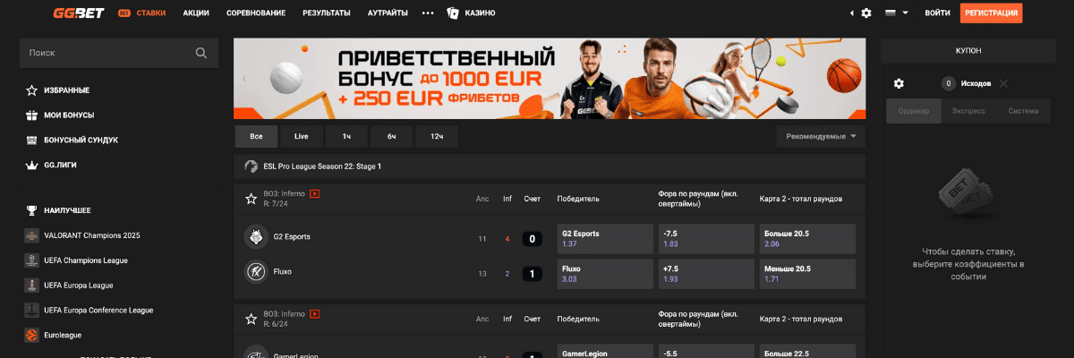 Отдельное внимание уделяется киберспорту – GGBet стал одним из первых брендов, сделавших его полноценной частью своей линии. Здесь можно делать ставки на Dota 2, CS:GO, League of Legends, Valorant и десятки других дисциплин, а также следить за ходом турниров через встроенные бесплатные трансляции. Платформа предлагает удобный выбор форматов – классические ставки в линии или динамичные прогнозы в лайве, где коэффициенты обновляются в реальном времени. Именно спортивный и киберспортивный разделы до сих пор является визитной карточкой GG.Bet.