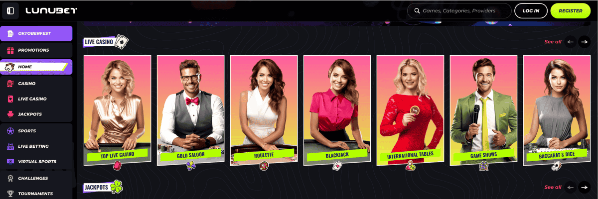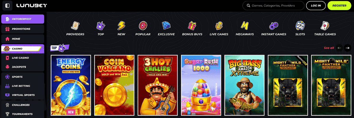 В Lunubet представлено более 9000 азартных игр, и коллекция продолжает ежемесячно пополняться. Для удобства каталог на lunubet1.com поделен на два больших раздела: Casino и Live Casino. Дополнительно есть категории Top, New, Popular. Изюминка сайта – эксклюзивные слоты, такие как Hot Chance, Super 25, Book of Ra 6.
