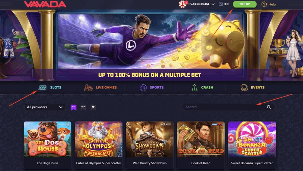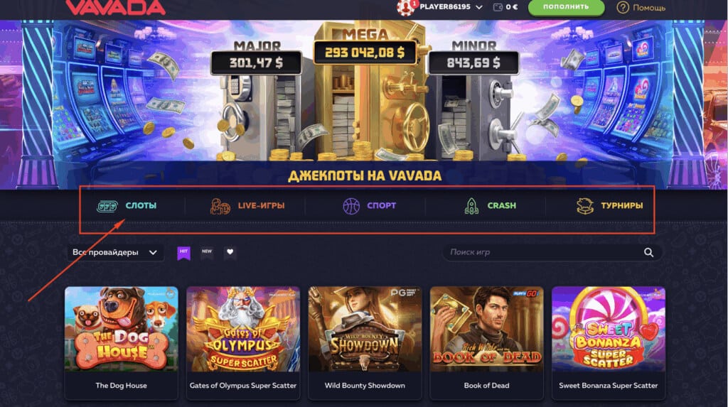 Сайт Vavada казино выполнен в современном темном дизайне с удобной навигацией через верхнее меню. Основные разделы включают слоты, лайв игры, спорт, краш игры и события, что обеспечивает быстрый доступ к различным типам развлечений. При желании можно использовать специальную строку поиска под основным меню. Это поможет быстрее найти конкретную игру или отсортировать доступные развлечения по провайдерам.